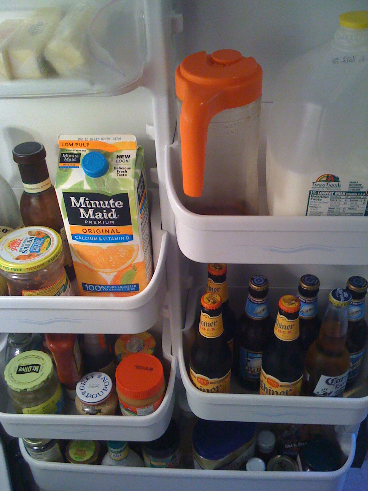 Instead of being sad about the lack of groceries, I’m thrilled at the contents of the fridge door. Here’s the main part of the refrigerator: