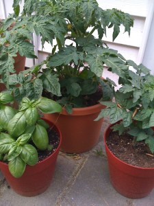 Almost all of my plants are alive a few weeks into the garden project. The only casualty so far was the snapdragon cluster. The tomato plants, basil, and hibiscus tree are all really happy. They looked like this on Saturday: