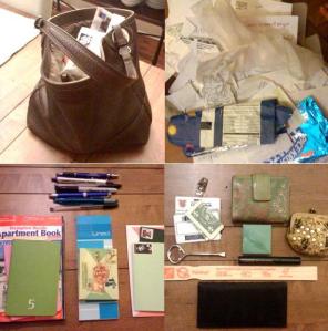 I didn’t put everything into one picture because, frankly, it was a scary pile.  I think the highlights are the amazing quantity of loose papers, the used dryer sheet in that pile, the painting supplies, and the guide to apartments in my area.  I’m not planning to move, it just seemed like a good thing to look through at some point.  Also, I like the fact that my wallet isn’t holding my license, debit card, or cash.  No wonder pick pockets never take advantage of me.  They can’t find anything.  There are usually a few books in my purse as well, but I think they might have jumped ship in hopes of finding a neater home.