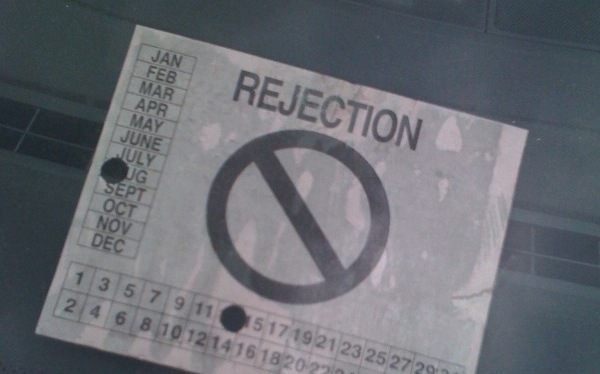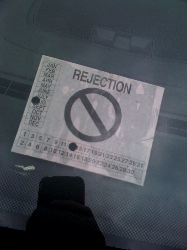 This is the inspection failure sticker that the dealership pasted on Gus’ windshield for all the world to see: