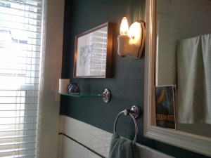My smaller bathroom was a pretty green color when I bought the house, but that pretty green didn’t go with the green I picked for the dining room walls so that led to white walls, then beige walls (leftover paint from another room), and now dark teal.  This was the not-so-bad 3.0 color: