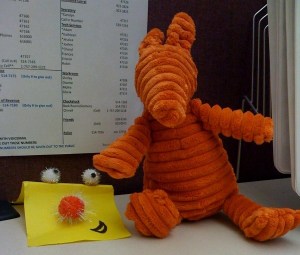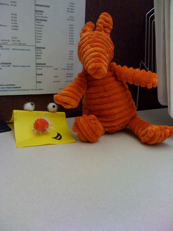 It’s time to let one of my friends entertain you for a few minutes. The friend of choice is one of my college roommates. She’s an engineer who totally breaks the typical engineer mold. One of those mold-breaking elements is that she loves to write miscellaneous poetry (almost always funny, not usually sappy or hard to interpret… much more to my liking than most poetry), she can paint up a storm, and she makes small, fuzzy creatures for her friends. She’s pretty darn creative. This is my most recently received creature: