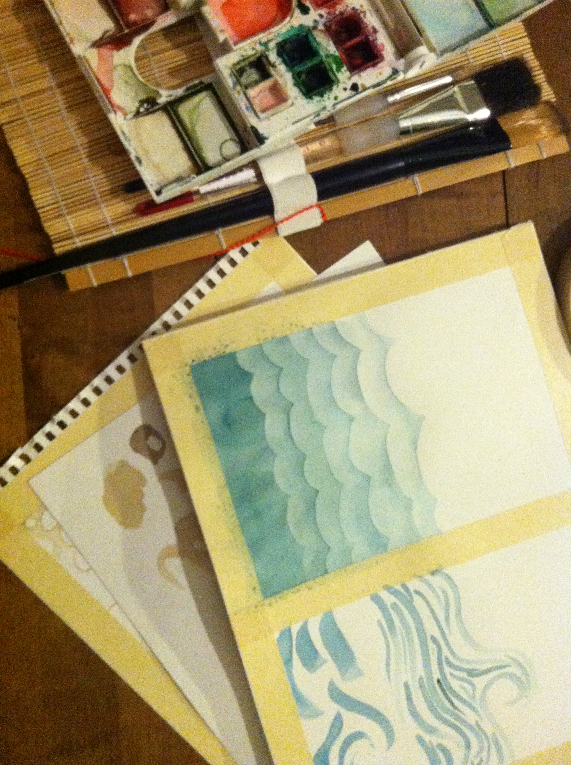 I have dibs on the top watercolor–whatever it turns out to be.