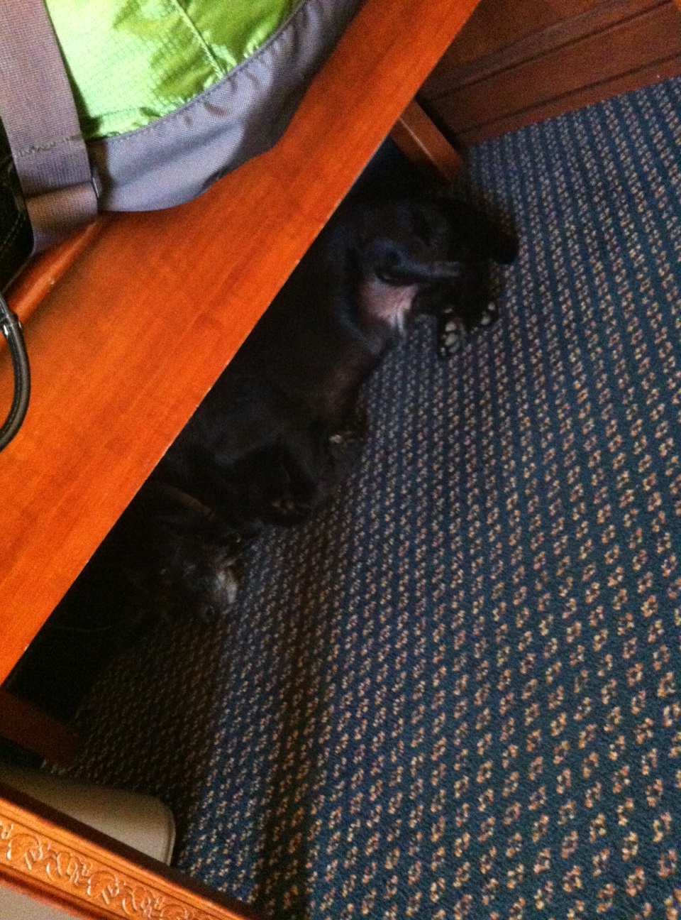 And here he is hiding under the luggage storage rack. Next best thing to the couch at home.