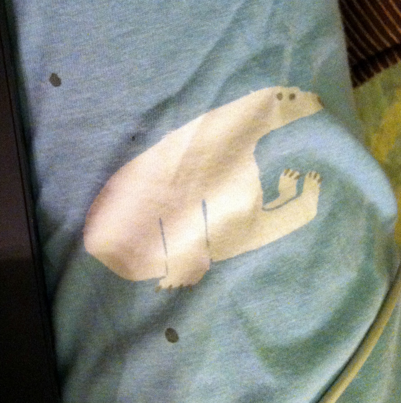 That is the polar bear from my favorite pair of pajama pants. Even with splattered green nail polish all over them, they’re still the best. They’re comfy and cute, and they make me happy, happy, happy.