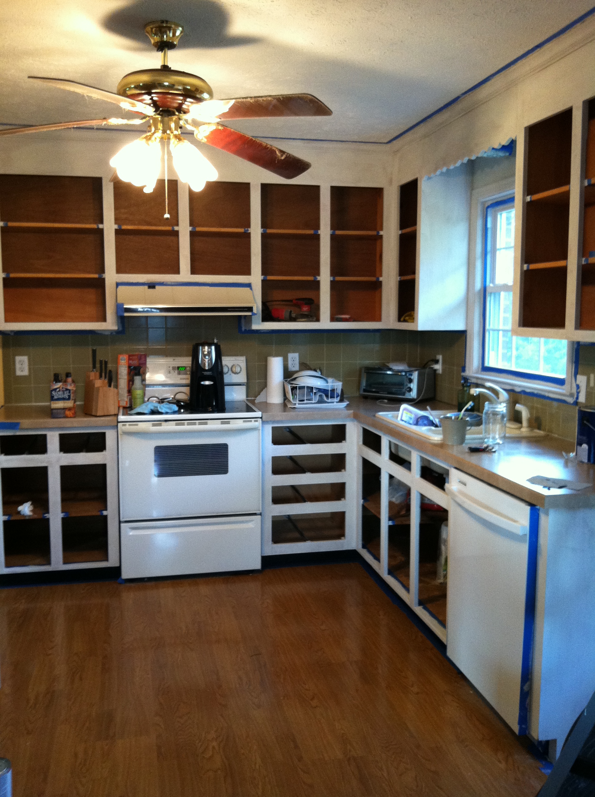 Even though we’re in splotchy primer stage right now, I like the white paint so much! It instantly made me feel better about the backsplash and the countertop. The white appliances even look fresh now. We already decided the green tile and appliances would stay, since they’re in good shape. No point in getting rid of things that are relatively inoffensive visually and otherwise do their jobs. And honestly, I would gladly keep the countertop, too. Paint is an incredible thing.