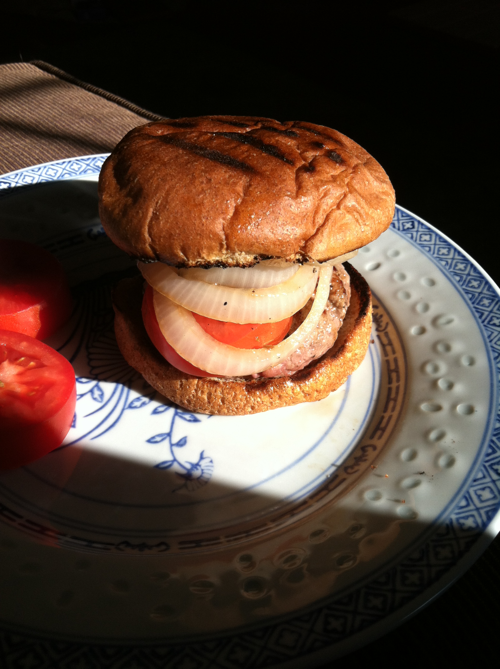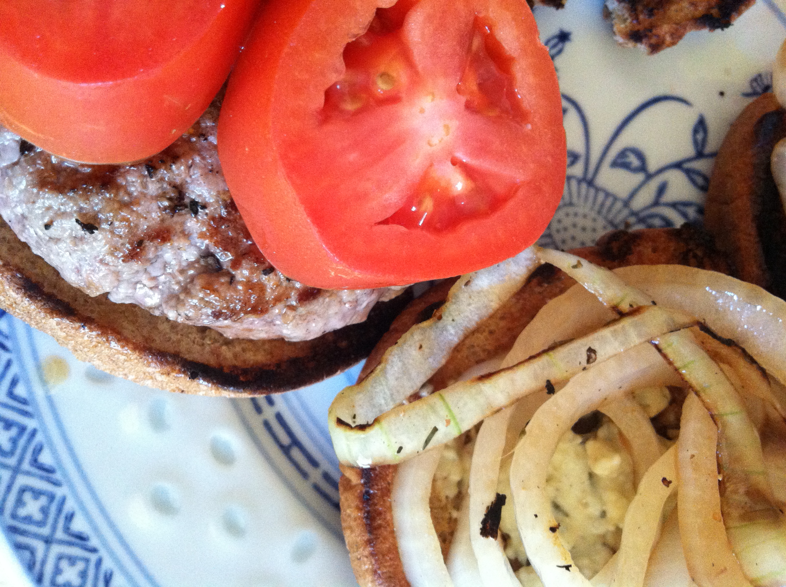 - Assemble in any order that you prefer. We feel strongly about order of operations, but you might disagree. Bun, sauce, burger, tomatoes, onions, bun. Sauce on both sides might be amazing. And we didn’t have any greens to throw into the mix.