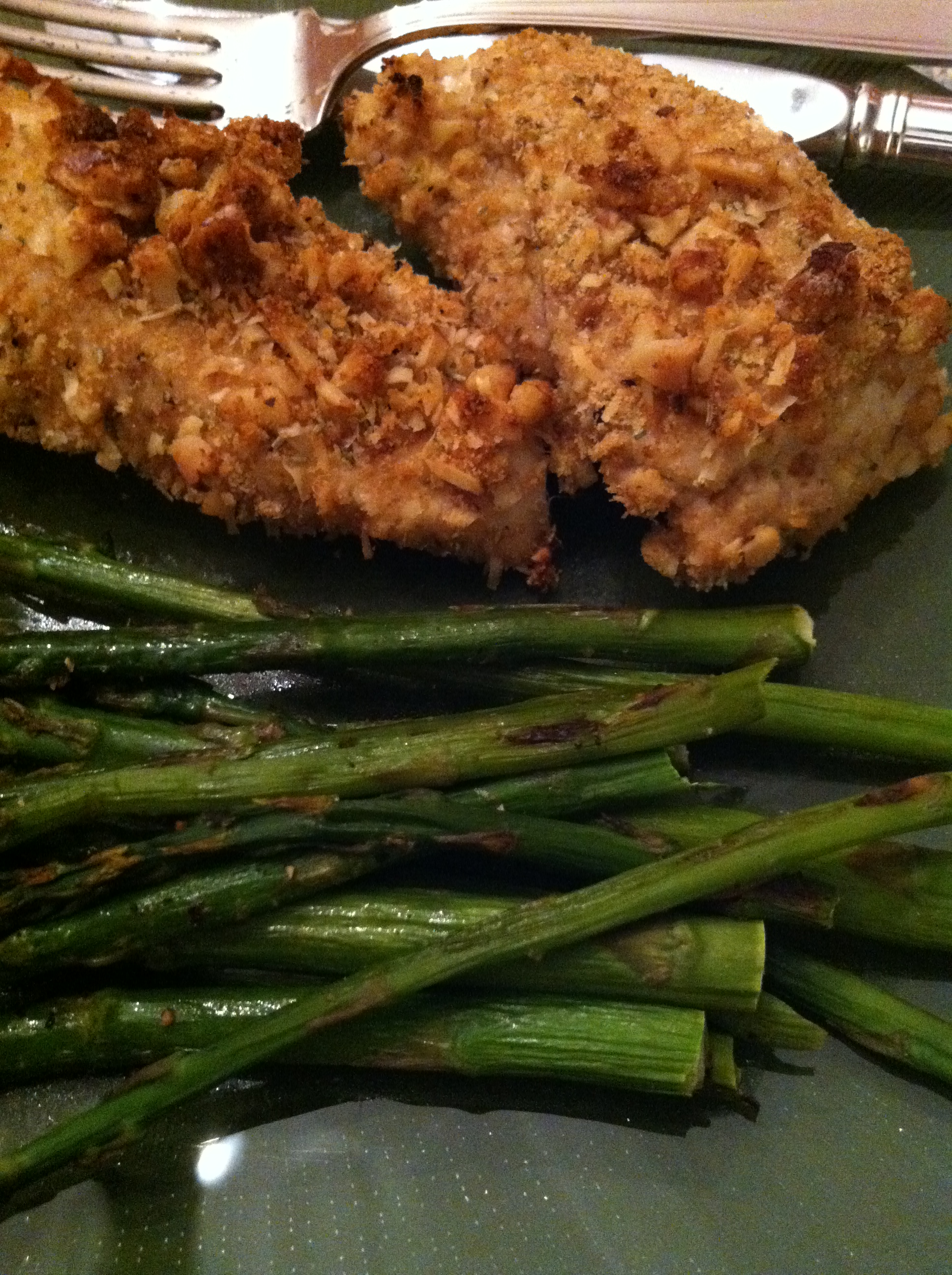 Then I took the first bite of my Walnut and Rosemary Oven-Fried Chicken (with asparagus) and was completely satisfied. This will be cooked again in our house, possibly on a regular basis. It’s so much healthier than fried chicken, and I will dare to say that I like it a whole lot more. There’s so much flavor and crunch!