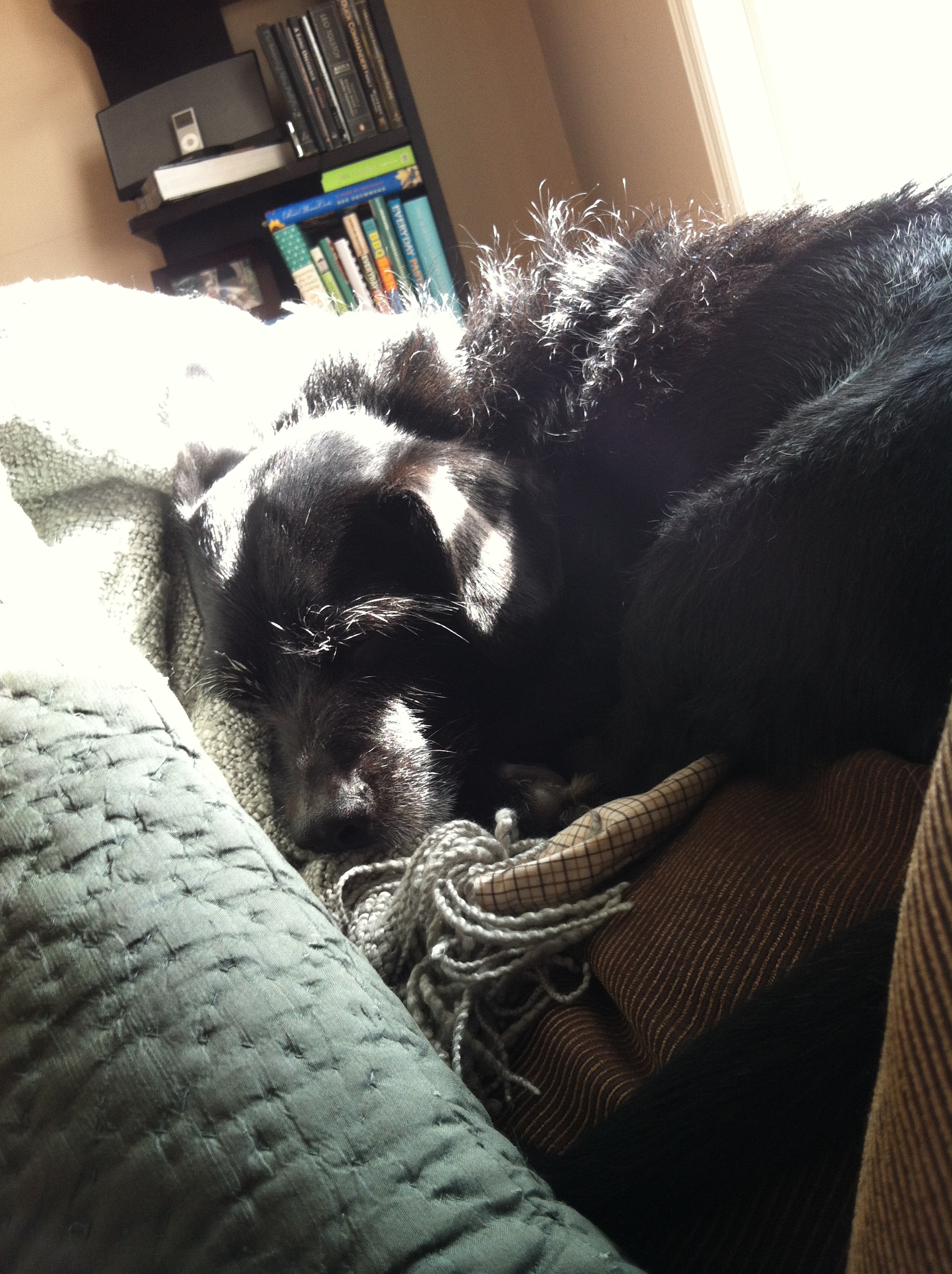 Last but not least, I have a Peanut whose lump-like nature is inversely related to my physical distress. He’s normally really difficult to move if he’s asleep–like mother, like dog. But on Monday and Tuesday when I thought I might just be one of those rare “just the normal flu” fatalities, if I twitched, Peanut moved very obligingly with me. He slept next to me for every hour of naps, and he watched as I wobbled to the sink to get water.