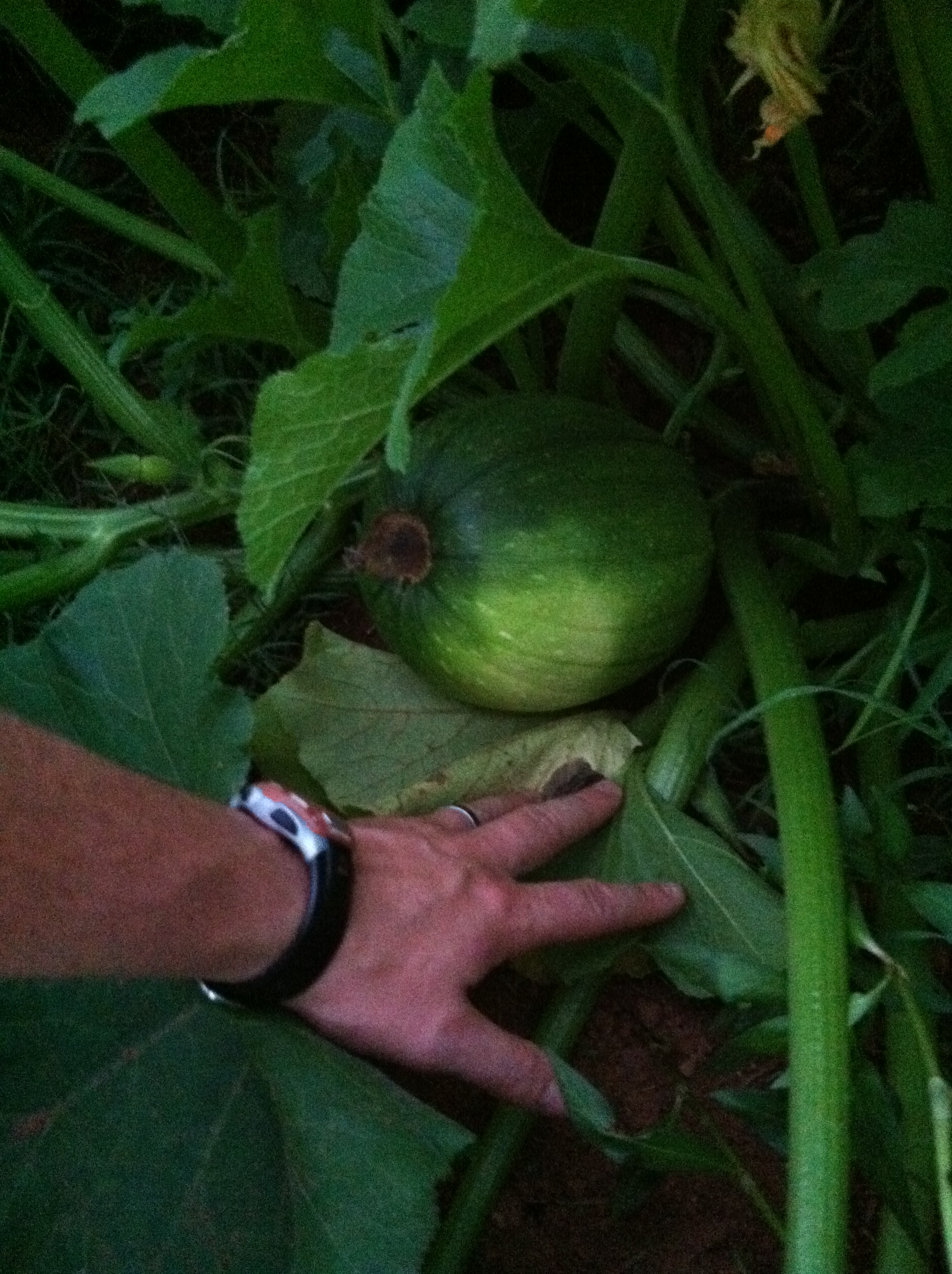 Then there was a spaghetti squash sighting. Yay! We didn’t eat anything at that stop. That will require at least a week-long wait and some time in the oven. It was still nice to see the veggies growing. I actually had to look this guy up to make sure it was really spaghetti squash, which is sad. It looks yellow and slightly different in the store, but sure enough, that’s spaghetti squash home veggie garden-style.