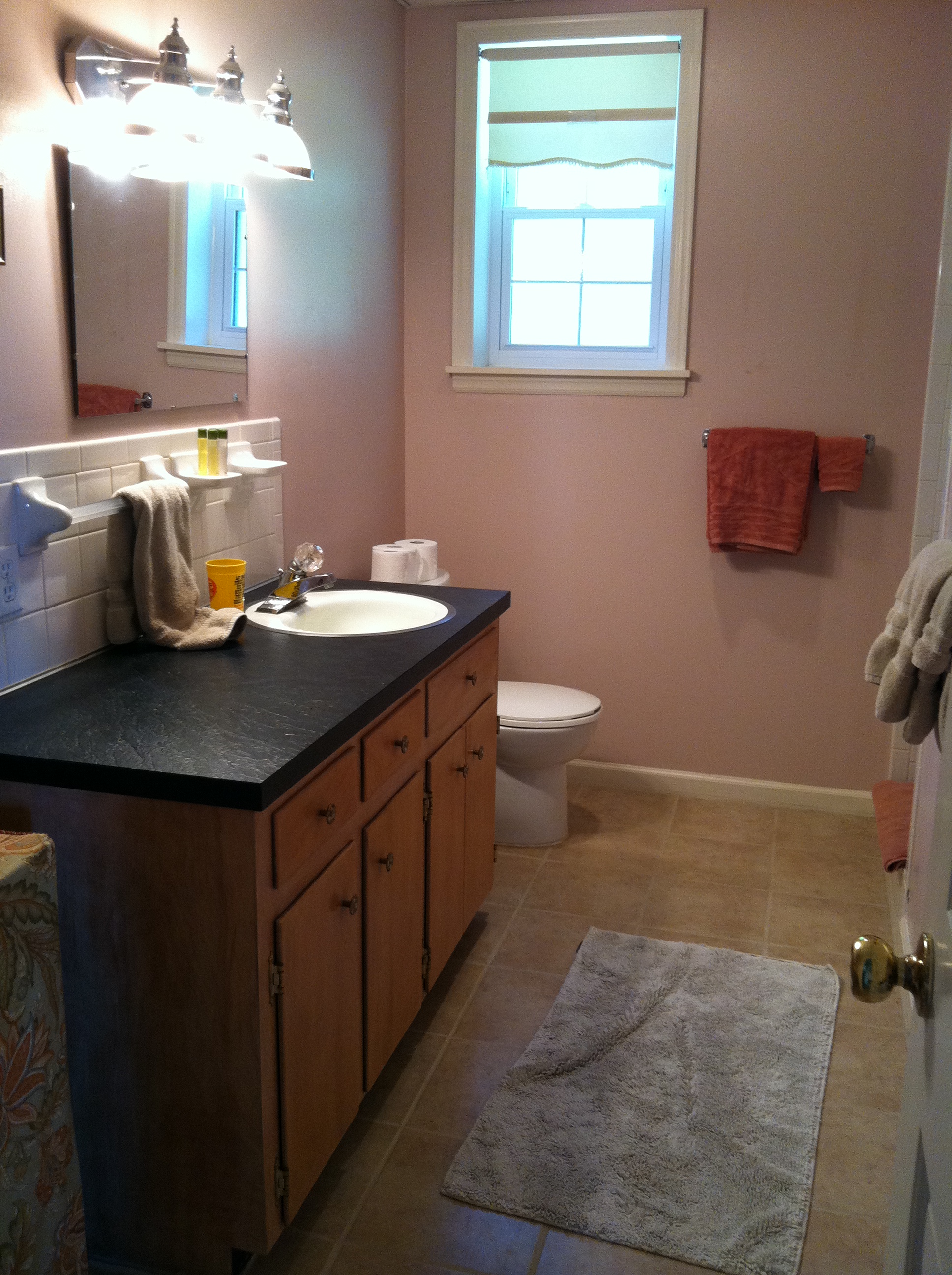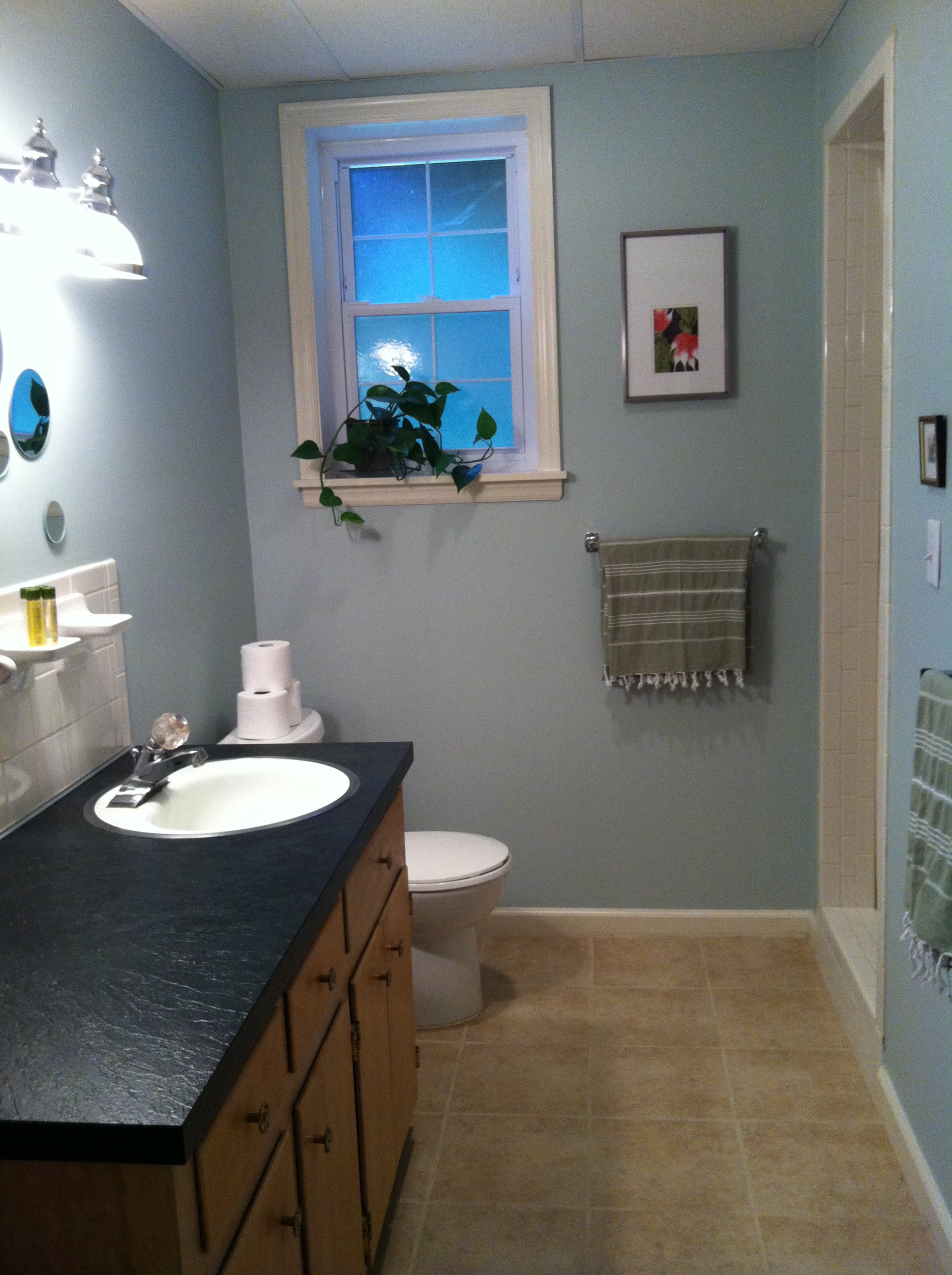 So the goal of yesterday’s project was to inject the best of the three bathrooms with some love and time so that it would be “done.” If we stay in the house for ten years, it’ll probably get a new light fixture and a sink, maybe even a different countertop and backsplash. But for now, it’s done.