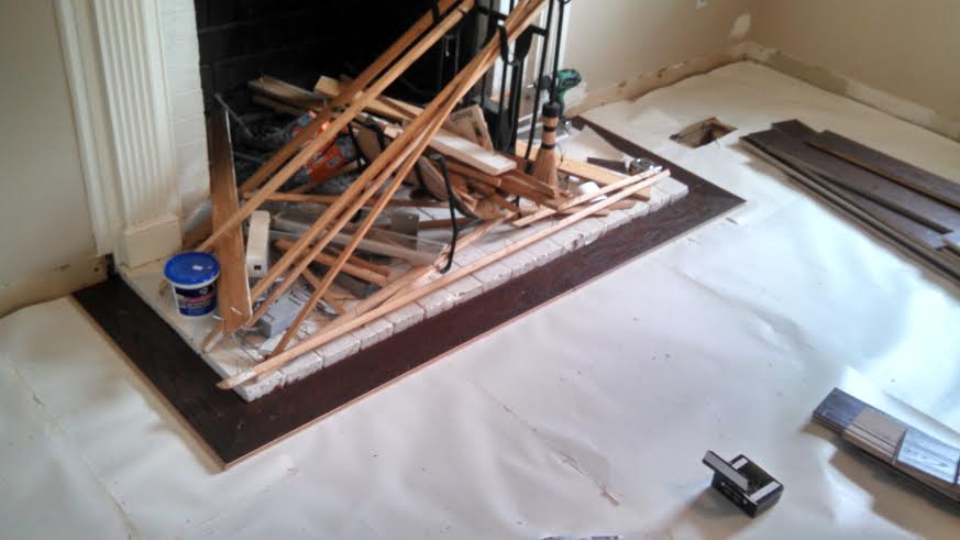 Scott was hard at work today. In addition to lots of computer schtuff, he got a start on the fun part of the floor project. Fun might be a relative term when you’re talking about floor installation, but I personally think the addition of good flooring is way more exciting than ripping out layers of linoleum. Check out that fireplace edge that’s all fancy-like and professional: