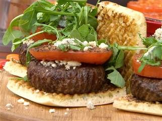 We tried one of Giada’s newer recipes last night, and let me just say that she hasn’t lost her touch. We did add about a minute of grilling time per side on the burgers, since we like our burgers cooked a little bit past medium rare (heresy for a steak, doesn’t bother me with a burger). Other than that, we followed the recipe as closely as possible. The grilled tomatoes with paprika and the Gorgonzola all melded into this warm, juicy sauce on top of the burger, and the arugula provided a tiny hint of crunch. Mmm. They looked very much like this: