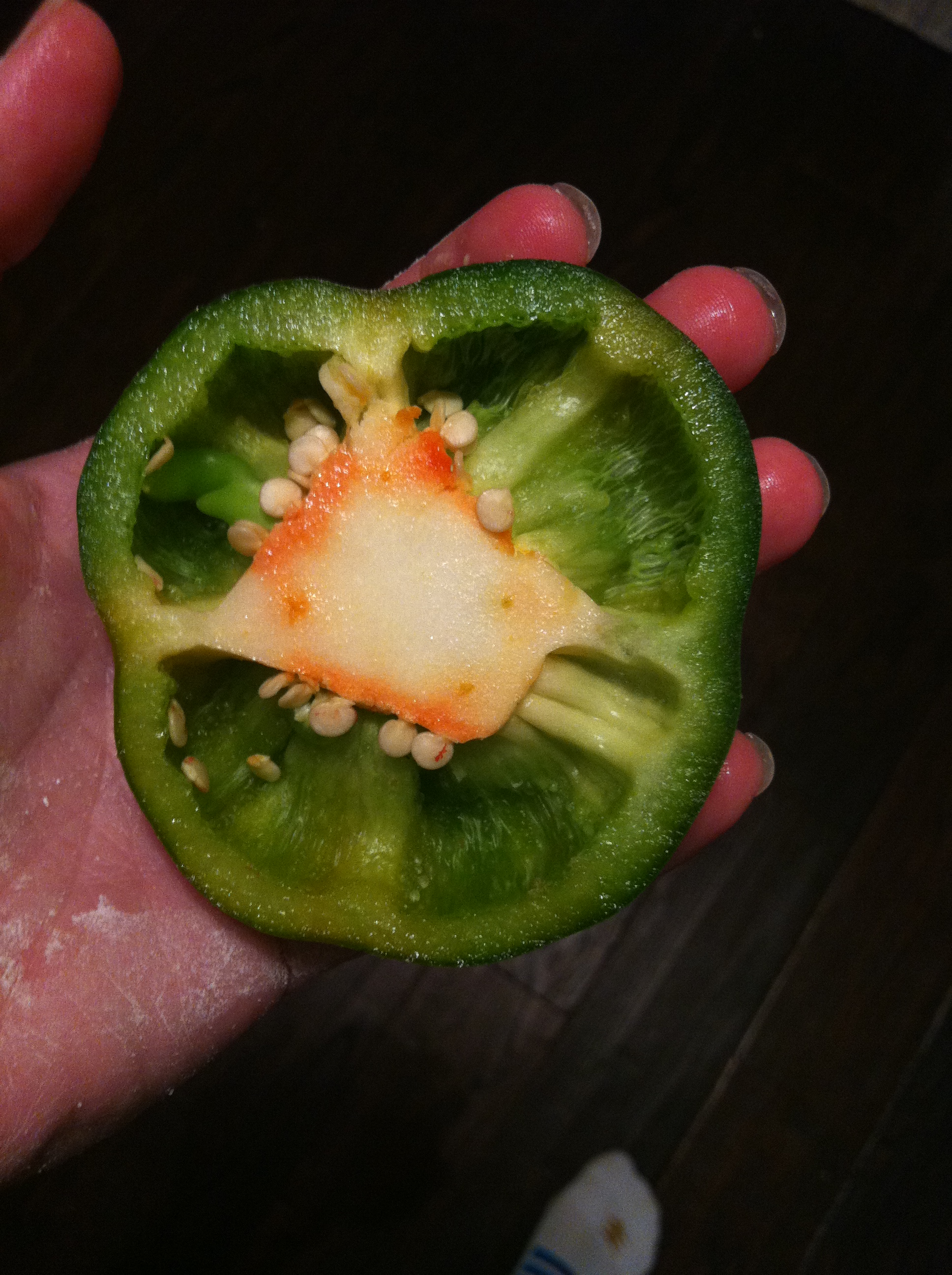 Look, it’s turning red! Just a teeny, tiny piece of red, but still red. And don’t be scared by my flour hands. It was homemade pizza night, and I didn’t feel like washing my hands between dough rolling and pepper chopping. They were washed when it mattered.