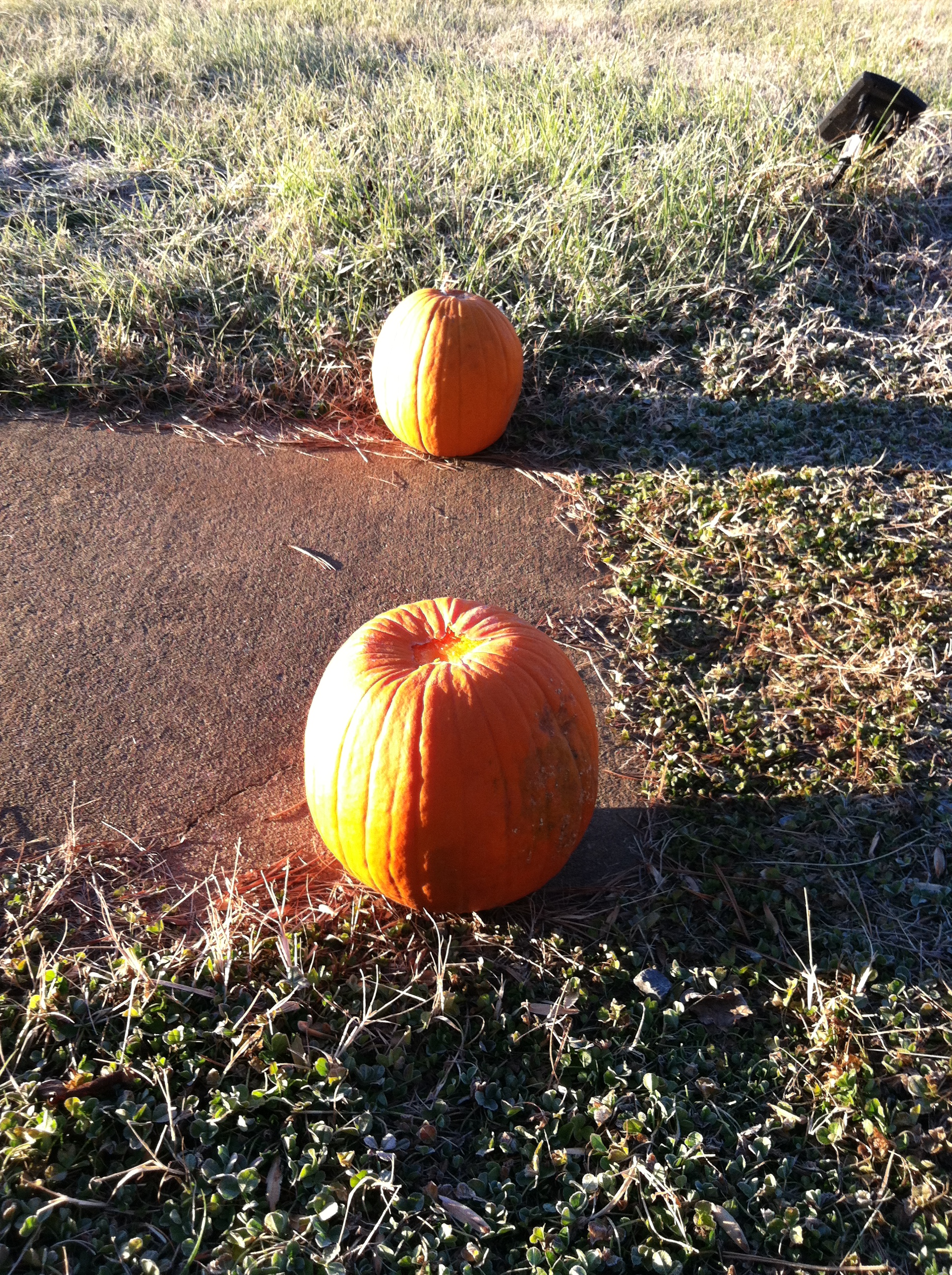 Those pumpkins that were slowly rotting away on the porch? We meant to take them to the veggie garden to become handy dandy compost. Instead, we greeted our guests at the walkway with them.