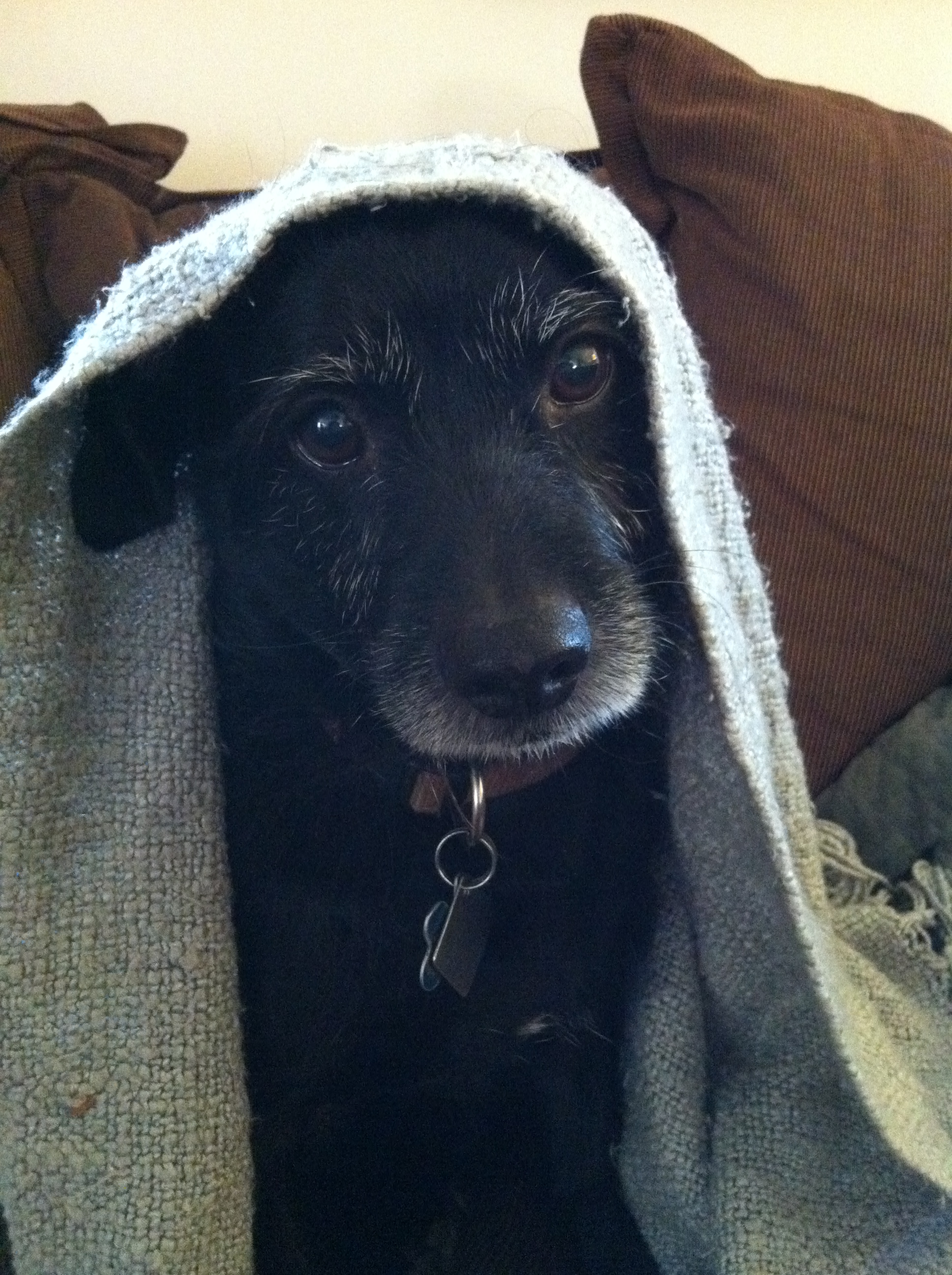 This is Peanut being so depressed that he won’t even shake off the blanket that I put on top of him. He was still under the blanket when I left the house. Poor kid. He really wanted those olives.