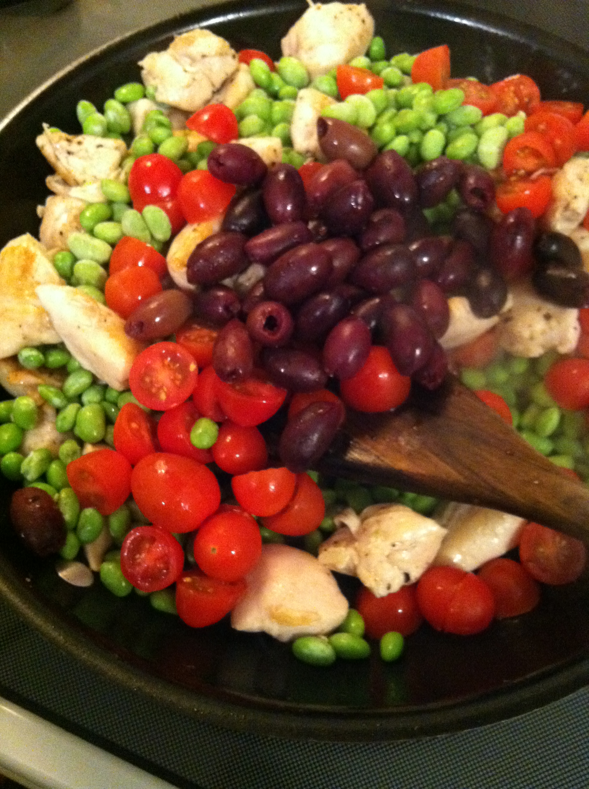 - Throw the frozen edamame into the pan to warm it up. That’s your only goal with the edamame. If you cook it too much, it loses that great crisp that I love so much. Once the edamame is getting warmer, add the grape/cherry tomatoes and the olives. Make sure they get adequately warm, then add anything else your heart desires, and enjoy.