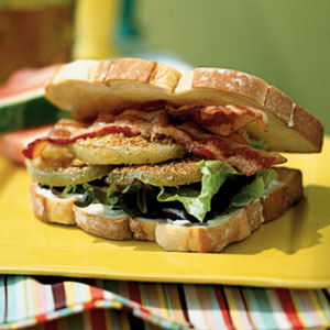 Sometime last week, we tried a new-to-us recipe for Fried Green Tomato BLT sandwiches. Or actually, Scott tried the recipe while I was at work. And it was a hit. So much so that we made them again the next day. There was only one adjustment between day one and day two–adding an egg wash to the cornmeal/tomato/frying process. It made the cornmeal crust much more satisfyingly crunchy, or so I heard.