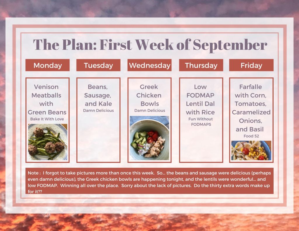 Instead of Monday’s plan, I decided to use meat from our freezer (previously from our yard), so it turned into venison meatballs with green beans. If the plan doesn’t quite work, there’s no need to worry about it. Cereal is always a solid substitute, too.